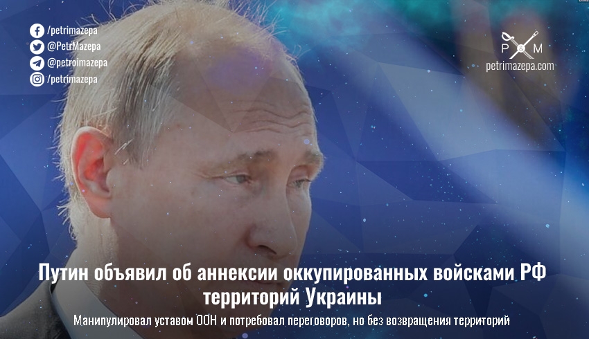 - 29 сентября Путин подписал указы о «признании суверенитета и независимости» двух областей Украины — Запорожской и Херсонской областей Украины. Причем в тексте этих документов он признает, что россия будет пытаться претендовать на всю территорию двух областей соседней страны.