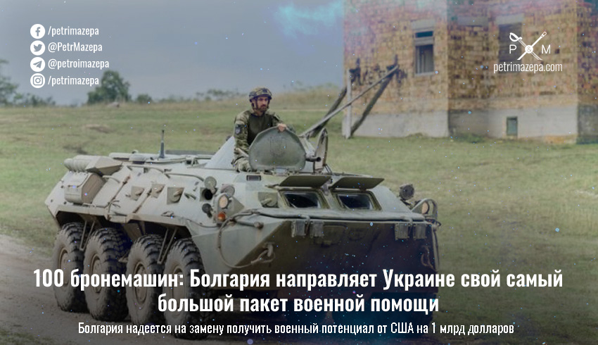Болгария объявила о своем крупнейшем пакете военной помощи Украине, в который войдут 100 бронированных машин из запасов. В основном транспортные машины пехоты. Пакет помощи уже был отправлен. И стал первым, о котором Болгария официально сообщила. Страна надеется, что взамен США согласует поставки в Болгарию современной военной техники на 1 млрд долларов.
