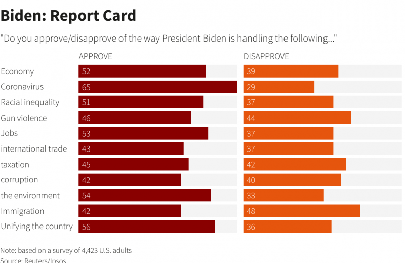 В целом американцы положительно оценили действия президента по объединению страны (56%), по созданию рабочих мест (53%), по управлению экономикой (52%), по борьбе с расовым неравенством (51%) и по защите окружающей среды (54%). Скорее негативно оценили только действия президента в вопросе иммиграции, также неоднозначно американцы относятся к работе Байдена по вопросу насилия с использованием огнестрельного оружия.