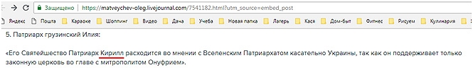 Пятым пунктом следует ссылка на Патриарха Грузинского Илию: «Его Святейшество Патриарх Кирилл расходится во мнении с Вселенским Патриархатом касательно Украины, так как он поддерживает только законную Церковь во главе с митрополитом Онуфрием». Ну, и? Да, Патриарх Кирилл расходится во мнении с Патриархом Варфоломеем. Констатация факта, не более. Можете даже не спрашивать: оригинал фразы не гуглится. Специально на память оставляю скрин со страницы Матвейчева: