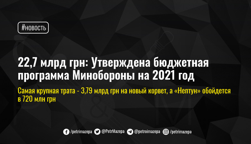 3,79 миллиарда гривен пойдет на строительство первого корвета типа ADA в Турецкой Республике, 436 миллионов гривен - на модернизацию флагмана Военно-морских сил Украины фрегата «Гетман Сагайдачный», а более 720 миллионов - на закупку первого противокорабельного ракетного комплекса Р-360МЦ «Нептун», передает «Думская».