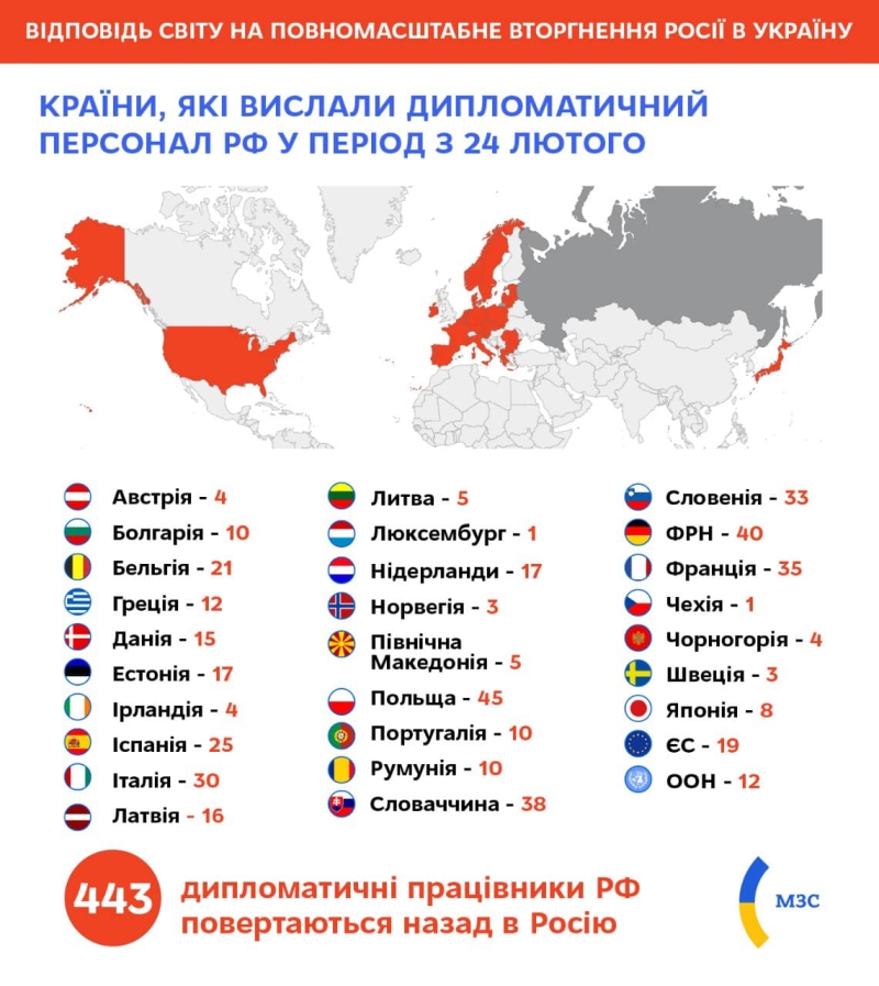 С начала вторжения россии на территорию Украины государства-партнеры выдворили 443 сотрудников российских дипломатических учреждений. Чем существенной сократили возможности страны-агрессора вести не только разведывательную деятельность, но и возможность продвигать свои нарративы.