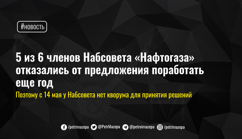 - 30 апреля вечером набсовет «Нафтогаза» заявил, что уходит в отставку с 14 мая. Кабмин попросил этого не делать.