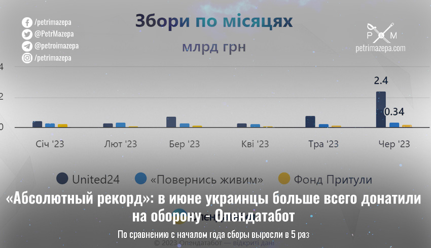 Сумма, собранная в июне — это абсолютный рекорд. И сборы выросли не только у платформы United24, но и у других благотворительных фондов — «Повернись живим» собрал на 17% больше, а фонд Притулы на 37% больше.