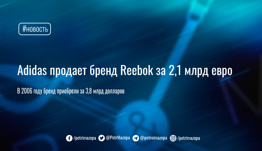 Немецкая компания Adidas заключила соглашение о продаже бренда Reebok американской Authentic Brands Group (ABG) за 2,1 млрд евро. Большая часть суммы будет выплачена наличными при закрытии сделки, которое ожидается в первом квартале 2022 года.