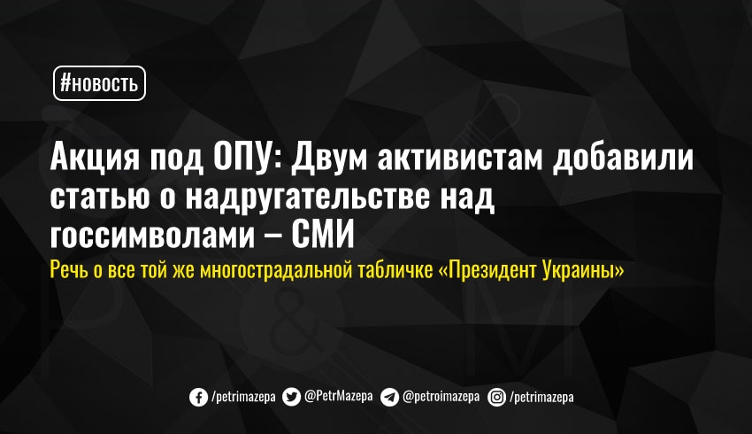 Двум активистам, которые принимали участие в протесте под Офисом президента Украины в поддержку Сергея Стерненко, выдвинули новые обвинения. Теперь их обвиняют также в надругательстве над символами государства, сообщает «Эспресо.ТВ» со ссылкой на Telegram-канал, созданный по их данным, активистами.