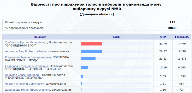 Тем временем, в Покровске, полиция по решению избрикома взяла под охрану здание, где находится избирательная документация. Полицейские будут обеспечивать сохранность документации, пока комиссия не восстановит работу. У ОИК №50 продолжают находиться граждане, которые выражают недоверие к результатам выборов, сообщает пресс-служба областной полиции. По данным ЦИК, пока (до пересчета голосов) победителем по округу является Руслан Требушкин от Оппоблока, который опередил Аксенова на 196 голосов. При этом только кандидат от ЕС заявил, что у него украли около 500 голосов. Аксенов также говорил о похищении голосов, но количество не называл.