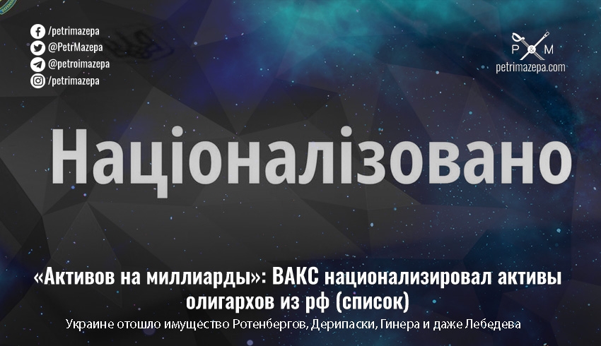 По материалам Государственного бюро расследований Высшим антикоррупционным судом приняты решения о национализации активов российских олигархов. В бюджет поступили активы российских миллиардеров на миллиарды гривень.