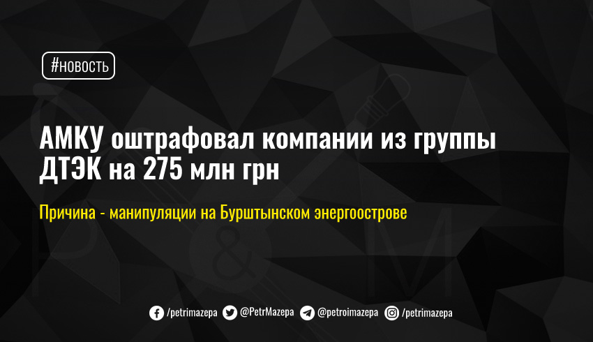 Антимонопольный комитет (АМКУ) оштрафовал компании из группы ДТЭК Рината Ахметова – ДТЭК Западэнерго и Д.Трейдинг на 275,2 млн грн за злоупотребление монопольным положением. Компании работают в торговой зоне «Остров Бурштынской ТЭС».