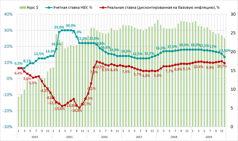 Учётная ставка НБУ и курс, 2014-2019 (%)