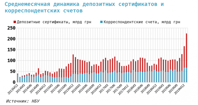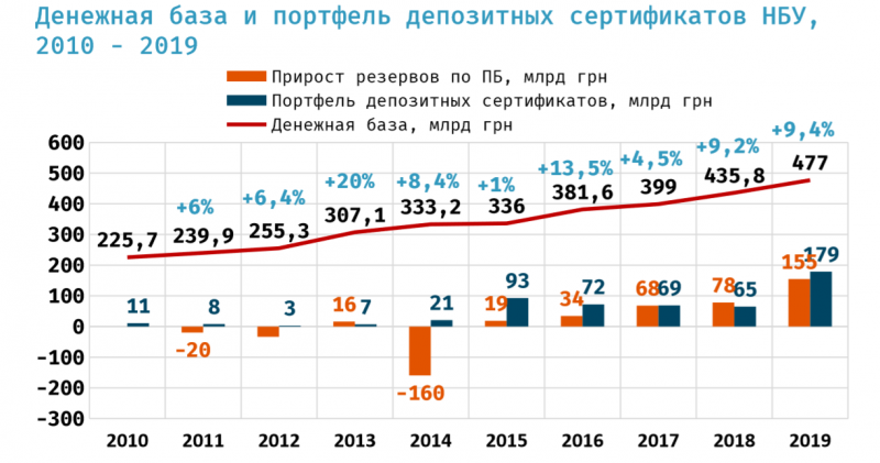 В то же время, прогноз прироста денежной базы на 2020 год не изменился и составляет всего 6,5% (эквивалент 30 млрд грн). Таким образом, выкуп валюты с рынка и сопутствующая эмиссия гривни будет абсорбироваться другими инструментами. Вероятно, планируется «связывать» эмитированную гривню инструментами регулирования ликвидности — депозитными сертификатами.