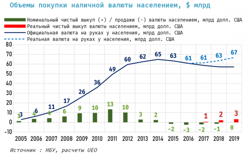 Так, предположение, что укрепление гривни обусловлено «разворотом» традиционных ожиданий населения относительно девальвации гривни, не подтверждаются итоговыми данными платёжного баланса. Чистая покупка валюты населением в 2019 году составила $3,3 млрд. К сравнению, чистый приток срочных вкладов (включительно – до года) населения в 2019 году составил всего 22,9 млрд грн. Что ещё раз подтверждает — основным инструментом накопления в 2019 году оставалась наличная валюта.