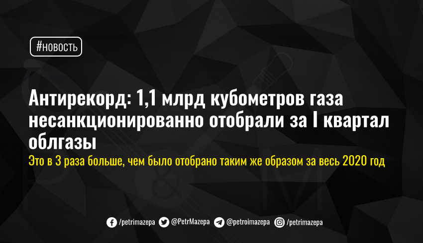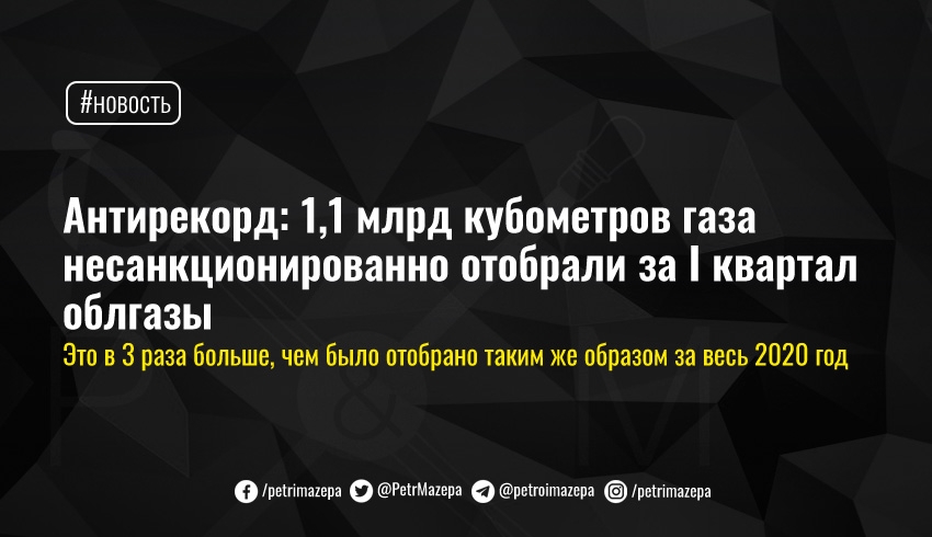 По оперативным данным в I квартале 2021 года Операторы ГРС (газораспределительных сетей - обл- и горгазы) несанкционированно отобрали из системы магистральных газопроводов почти 1,1 млрд кубометров газа для собственных производственно-технологических расходов (ПТР). Это в три раза больше, чем за весь 2020 год.