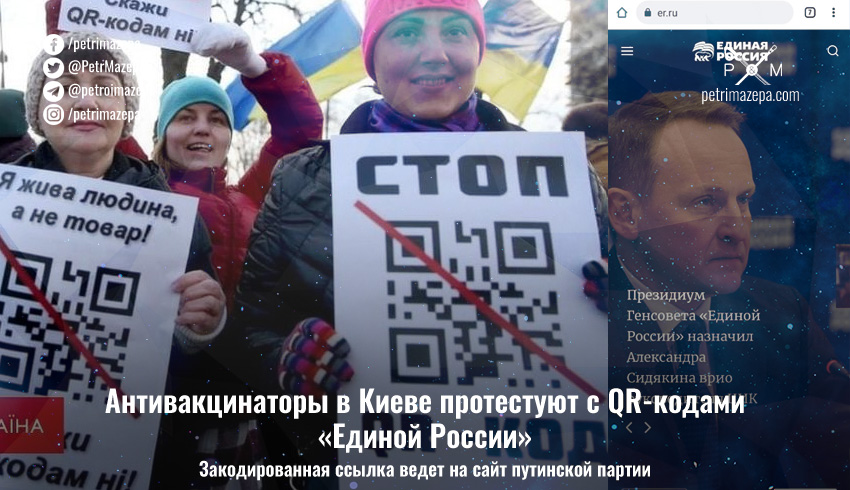 Многие антивакцинаторы, вышедшие сегодня на протесты в Киеве, несли с собой плакаты против QR-кодов. При проверке напечатанного на плакатах кода можно увидеть, что он ведет на сайт партии «Единая Россия».