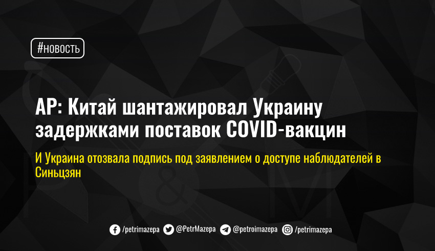 В СМИ появилась информация о том, что Китай оказывал давление на Украину и шантажировал страну тем, что заблокирует поставки 500 тысяч доз вакцин от коронавируса. В ответ Киев отказался поддерживать в ООН документ, призывающий к тщательному изучению ситуации с правами человека в Синьцзяне.