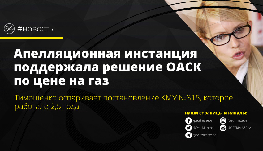 Шестой апелляционный административный суд оставил в силе решение судьи Окружного административного суда Киева (ОАСК) Евгения Аблова по иску Юлии Тимошенко к Кабмину и «Нафтогазу». Газовый эксперт в сфере зубожиння требовала признать незаконной цену на газ, которая была установлена постановлением КМУ №315.