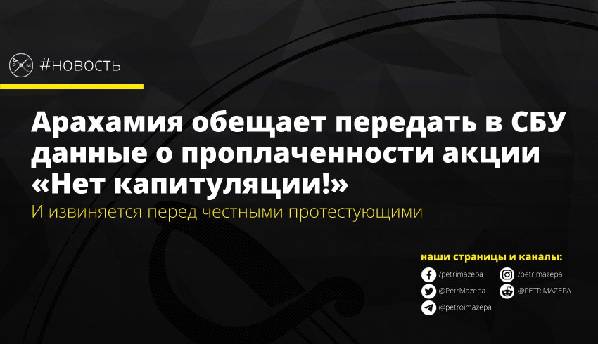 Председатель парламентской фракции «Слуга народа» Давид Арахамия заявил, что намерен передать всю имеющуюся у него информацию о проплаченности некоторых участников митинга «Нет капитуляции». Он также сообщил, что «переосмыслил» сказанное, и хочет публично извиниться перед всеми честными участниками митинга.