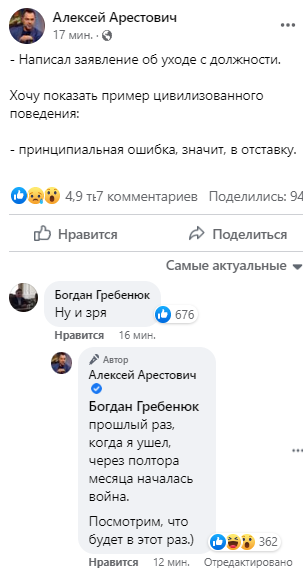 Специалист по выражению собственного мнения по любому вопросу, Алексей Арестович, решил снова потыкать палочкой в инфосферу. И опубликовал фотографию своего заявления об увольнении.
