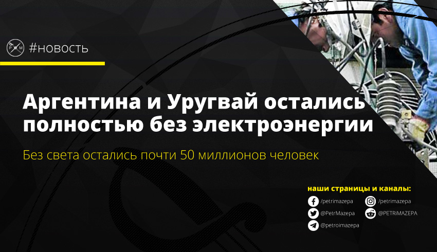 По сообщениям энергетических компаний 16 июня без электроснабжения остались более 48 миллионов человек. По данным энергетической компании Edesur Argentina, причиной отключения света является «массовые сбои» в энергосистеме. Уругвайский провайдер UTE заявил, что сбой в аргентинской сети произошел в 7 утра по местному времени. Это вызвало массовое отключение электричества по всей территории стране и в некоторых районах соседней, сообщает DW со ссылкой на местную прессу.