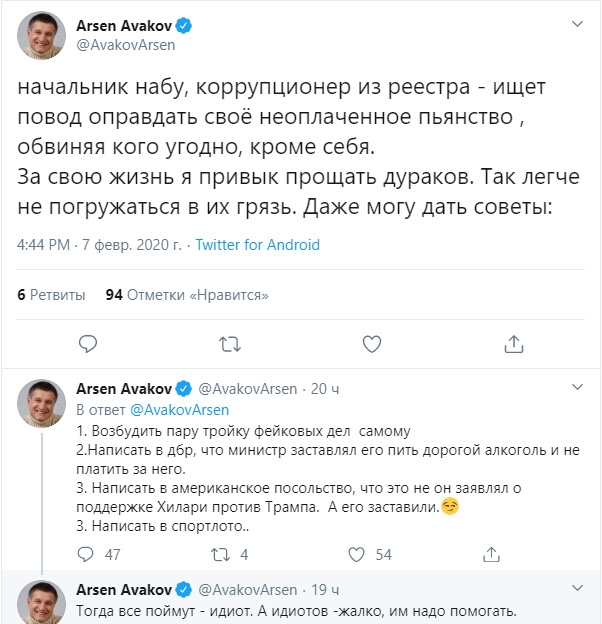 По мнению Авакова достаточно, Сытнику стоит возбудить пару фейковых дел, написать заявление в ГБР и посольство США. После чего – обратиться в Спортлото. Выполнение этого ритуала приведет к том, что «все поймут — идиот. А идиотов — жалко, им надо помогать».