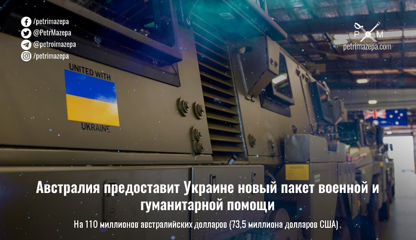 Правительство Австралии объявило, что предоставит Украине новый пакет помощи на сумму 110 миллионов австралийских долларов (73,5 миллиона долларов США). Он будет состоять из военной помощи техникой и боеприпасами, и из гуманитарной части.
