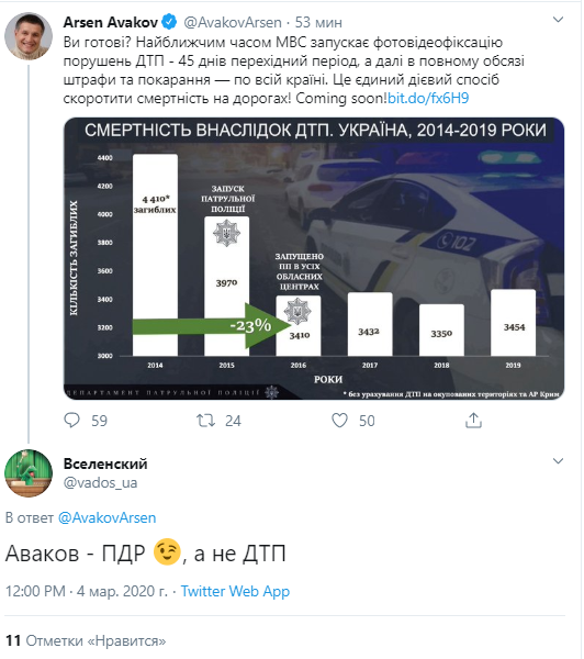 И если в блоге Аваков писал по-русски, то в Twitter попытался по-украински, из-за чего получилось «нарушение ДТП». Но читатели тут же поправили министра.