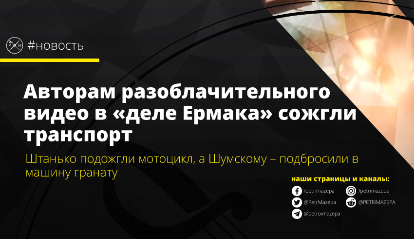 Авторы скандального видео с участием брата главы Офиса президента Дениса Ермака, Дмитрий Штанько и Сергей Шумский сообщили о ночном нападении неизвестных, которые повредили транспорт фигурантов дела. Штанько подожгли мотоцикл, а Шумскому – подбросили в машину гранату.