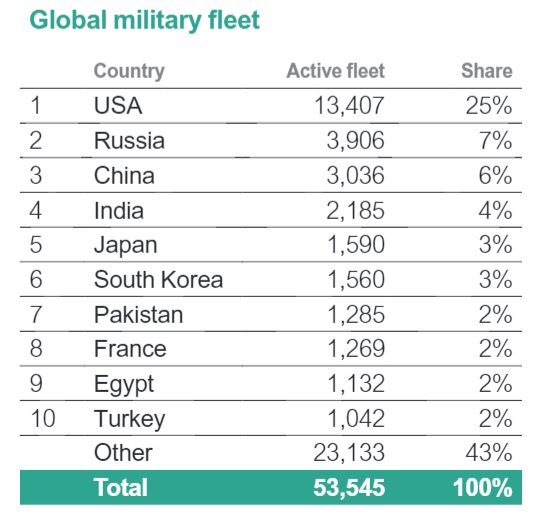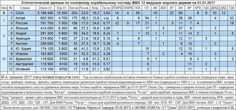 В области морского флота перевес ещё больше. Во времена, когда Великобритания считалась владычицей морей, она поддерживала «двойной стандарт». Это означало, что флот по своему водоизмещению должен быть крупнее, чем два самых больших флота, идущих за ним следом. Флот США сейчас больше, чем восемь крупнейших флотов мира, идущих следом, и это при том, что большая часть крупнейших флотов принадлежит союзникам США, Японии, Франции, Великобритании и Италии.