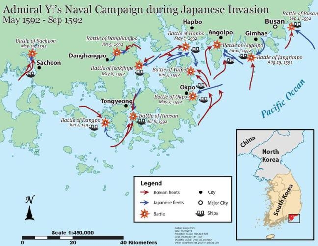 …Потому что Ли Сунсин сложа руки не сидел. А если и сидел, то только в процессе того, как плыл уничтожать врага. Карта его деятельности по истреблению оккупантов только за 1592-й впечатляет:
