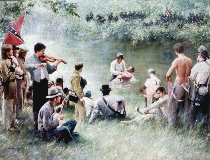 А потом была Война Севера и Юга, в которой священники с обоих сторон сыграли роль идеологической поддержки своих войск. Южные баптисты, как и все религии Юга, в подавляющем большинстве поддержали Конфедерацию, провозгласив — теперь официально — рабство как часть южного уклада священным, КША — богоизбранными, а северян — безбожными янки. Баптистские пасторы (это касалось и представителей других конфессий) служили в южной армии не только в качестве капелланов, но временами и как офицеры. В свою очередь, северные баптисты вовсю поднимали боевой дух солдат Союза.