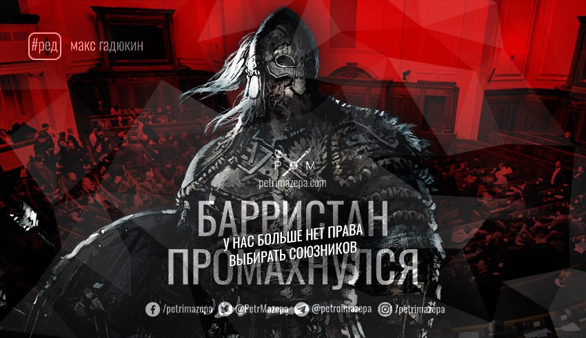 Для этого Банковой нужно, чтобы активные граждане проявляли рыцарские комплексы и ни в коем случае не объединялись. Барристаны, слишком благородные для того, чтобы запачкать руки — её главная надежда. Ведь они сами изгадят все благие начинания, потому что вместо идеи будут рассматривать биографии авторов. Тогда можно врать и воровать, врать и воровать.