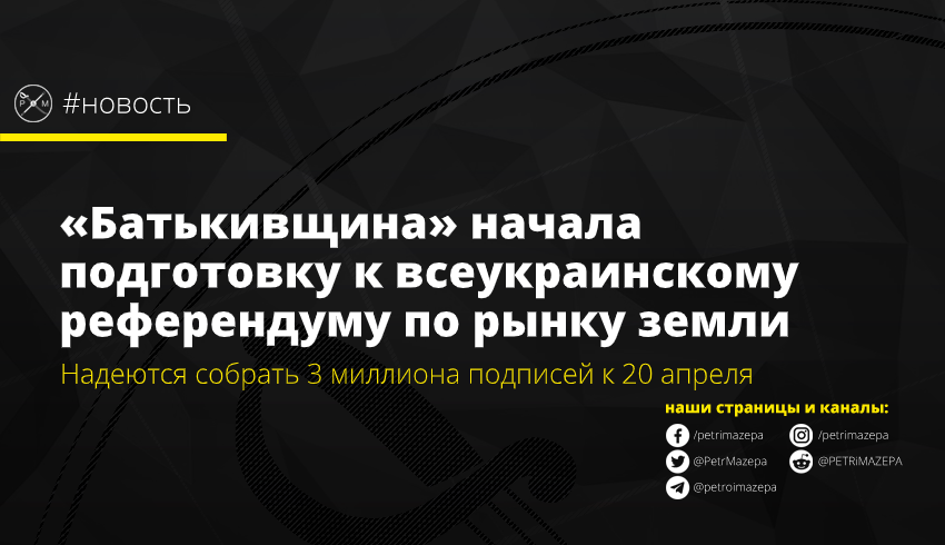 Лидер партии «Батькивщина» Юлия Тимошенко объявила о том, что ее политсила начала подготовку к всеукраинскому референдуму по вопросам открытия рынка земли.