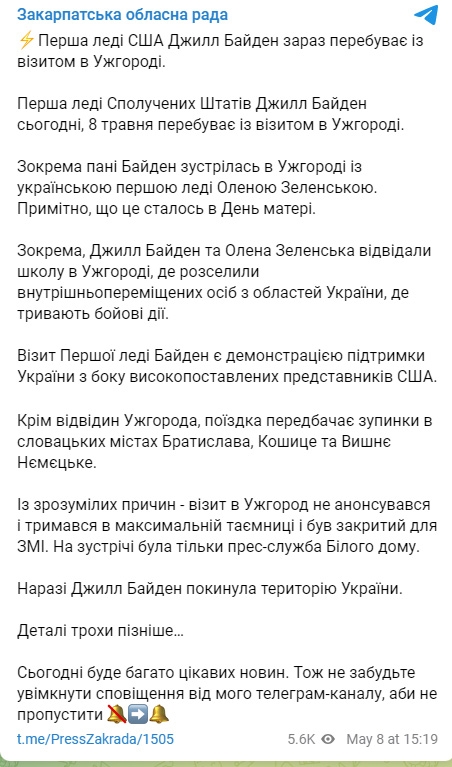 «В настоящее время Джилл Байден покинула территорию Украины. Детали чуть позже…» — заканчивает свое сообщение облсовет, так и не определившись — уже покинула первая леди США территорию Украины или еще совершает визит в Ужгород. Или мы чего-то не знаем про Ужгород?