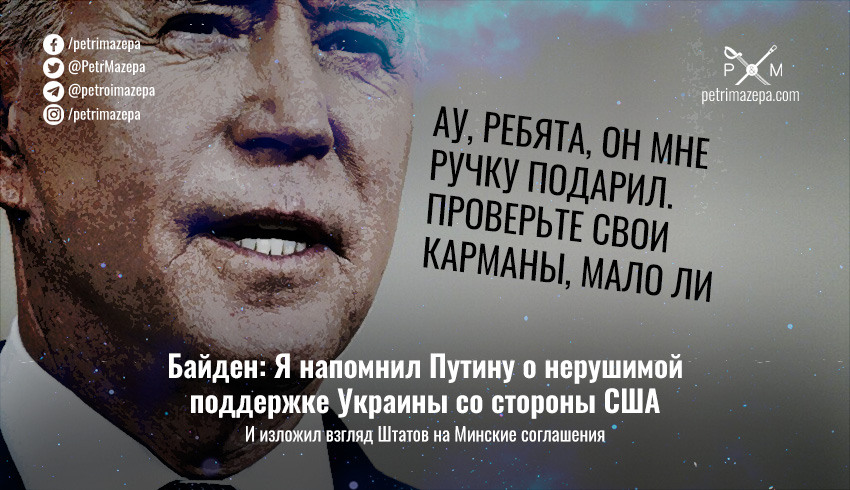 Что касается нашей страны, Байден заверил, что напомнил Путину о нерушимой приверженности суверенитету и территориальной целостности Украины со стороны США и что изложил взгляд Штатов на Минские соглашения. «Он не противоречил мне, но, конечно, различия были», - отметил Байден.