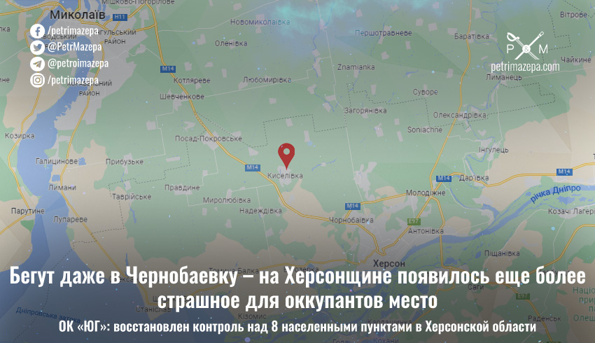 Оперативное командование «Юг» сообщило, что вчера украинские защитники восстановили контроль над 8 населенными пунктами в Херсонской области. А также хорошенько накрыли рашистов в Киселевке, что к северо-западу от Чернобаевки. Били так хорошо, что орки попытались скрыться в самой Чернобаевке.