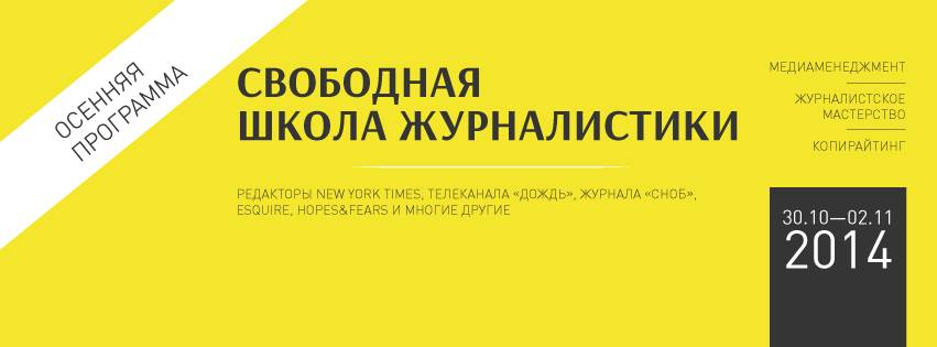 С 30 октября по 2 ноября пройдет десятый образовательный курс медиаменеджмента, журналистики, копирайтинга и писательского мастерства от Свободной школы журналистики. 4 интенсивных дня с 9.00 до 21.00, 25 лекций и семинаров.
