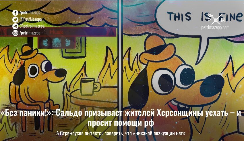 Гауляйтер Херсонщины, коллаборант Сальдо записал обращение — заявил, что предложил всем жителям Херсонской области «выехать в другие регионы», то есть в россию. И пока Сальдо просит россию помочь вывезти жителей Херсонщины, другой коллаборант, Кирилл Стремоусов пытается заверить, что обращение Сальдо — это не призыв к эвакуации, и вообще «без паники».