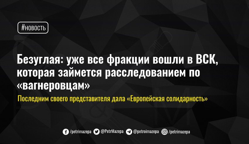 - 27 мая председатель ВСК Верховной Рады по расследованию действий должностных лиц против суверенитета Украины Марьяна Безуглая сообщила, что первым рассмотренным вопросом будет ситуация с «вагнеровцами». И результаты в ВСК имени монобольшинства готовятся выдать уже к концу июля.