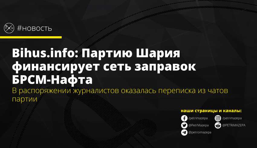 В СМИ появились данные, что «Партию Шария», лидером которой является блогер Анатолий Шарий, тайно финансирует всеукраинская сеть автозаправочных станций «БРСМ-Нафта». По словам журналистов, им удалось получить доступ к ее внутренним Telegram-чатам, участниками которых являются председатель политической силы Александр Вьюник, ответственные за информационную и финансовую политику Иван Мамчур и Анжела Ларкина, а также жена Анатолия Шария Ольга.