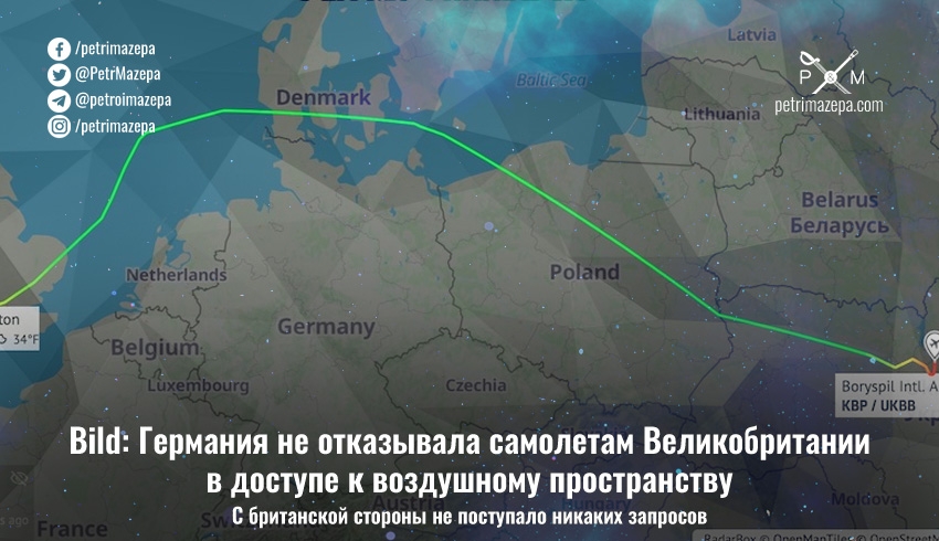 «Германия не отказывала в доступе к своему воздушному пространству, поскольку Великобритания не подавала запрос, между Великобританией и Германией не было спора по этому вопросу», - сообщил журналист издания Bild Юлиан Репке со ссылкой на заявление Минобороны Великобритании.
