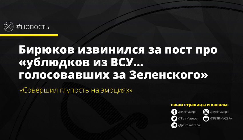 Бирюков извинился за пост про «ублюдков из ВСУ… голосовавших за Зеленского»