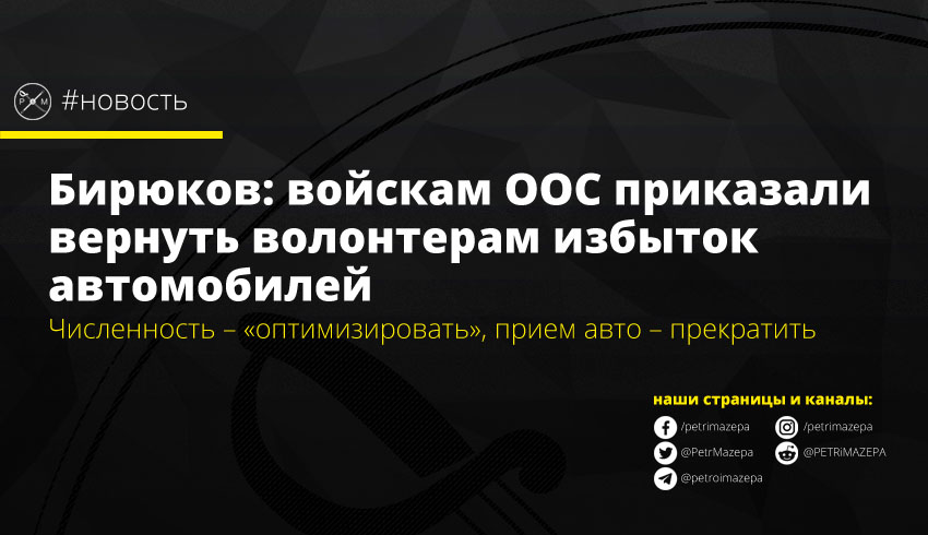 Волонтер и экс-советник президента Украины Юрий Бирюков поделился текстом распоряжения командования ООС о прекращении приема бесплатных автомобилей в войска, «оптимизации» численности и возврата волонтерам оставшихся после оптимизации автомобилей.