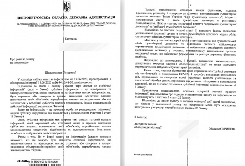 Мы честно предлагали помощь. Например, бесплатно провести юридический ликбез сотрудникам. Нам гордо отказали. Кстати, пока сотрудник Днепропетровской ОГА выдумывал нам двухстраничный, в чем же мы не правы, Запорожская ОГА просто выполнила свою часть работы. Она успела прислать нам полную раскладку в договорах, актах, приказах и всем на свете о полученной благотворительной и гуманитарной помощи.