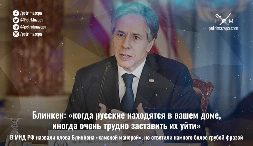 Госсекретарь США Блинкен: "Урок недавней истории заключается в том, что, если однажды русские оказались в вашем доме, бывает очень трудно заставить их уйти".