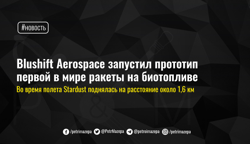 Стартап bluShift Aerospace совершил удачный пуск прототипа своей ракеты на биотопливе Stardust. Во время первого полета Stardust поднялась всего на расстояние около 1,6 км и затем успешно приземлилась на парашюте. В ходе первого полета испытывались свойства нового сплава под названием нитинол, созданного другим стартапом, лабораторией Келлога в Салеме, штат Нью-Гэмпшир. Второй полет будет суборбитальным, а затем новая версия ракеты достигнет околоземной полярной орбиты.