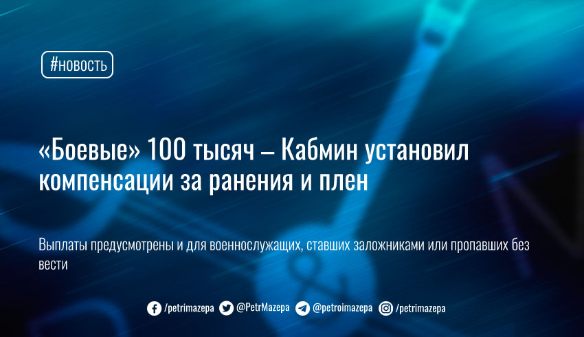 На вчерашнем заседании правительства было принято решение о внесении изменений в постановление о выплатах военнослужащим и полицейским во время военного положения. Теперь «боевые» 100 тысяч гривень будут выплачиваться раненым, пленным и пропавшим без вести защитникам Украины.