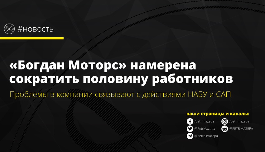 Автокомпания «Богдан Моторс» намерена сократить 600 работников. Ранее в пресс-службе сообщали, что численность производственного персонала составляет около 1,2 тыс. человек, т.е. сокращение коснется половины работников. В компании решение сократить штат объяснили существенным сокращением заказов. Последнее в компании связывают с действиями НАБУ и САП.