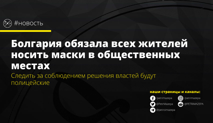 Власти Болгарии приняли решение обязать всех жителей страны носить защитные маски, когда они находятся в общественных местах. Это касается как закрытых, так и открытых общественных мест, сообщает Espreso.TV со ссылкой на болгарские СМИ.
