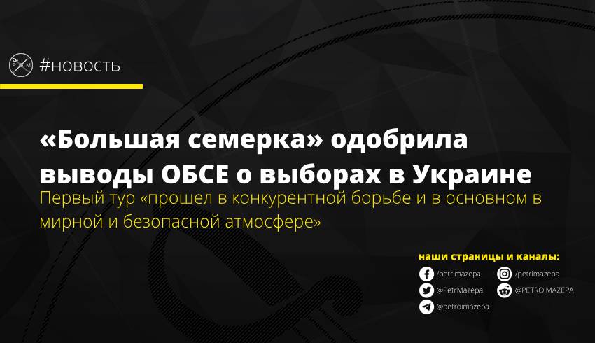 «Послы G7 приветствуют предварительные выводы ОБСЕ и Бюро по демократическим институтам и правам человека и отмечают, что первый тур президентских выборов на Украине, проведенный 31 марта, прошел в конкурентной борьбе и в основном в мирной и безопасной атмосфере», - говорится в сообщении, опубликованном в Twitter организации.