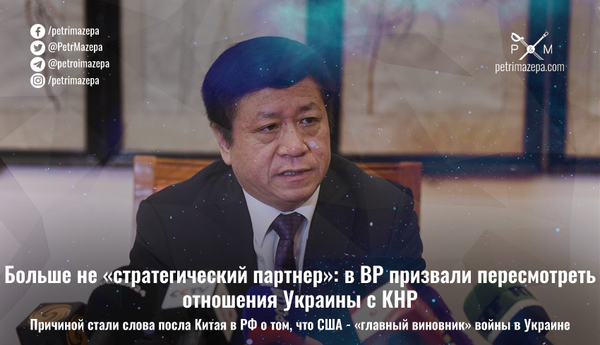 Посол КНР в РФ Чжан Ханьхуэй заявил в интервью ТАСС, что «главный виновник украинского кризиса — Вашингтон». После этого председатель комитета Верховной Рады по вопросам внешней политики Александр Мережко призвал пересмотреть отношения Украины со считавшимся стратегическим партнером Китаем. Поскольку теперь Китай явно показал, на чьей он стороне в этой войне.